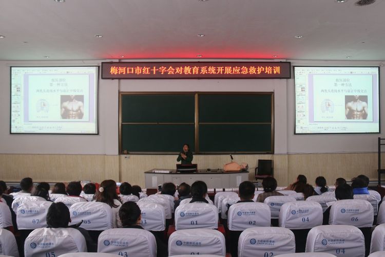 为弘扬“人道、博爱、奉献”的红十字精神,加强生命健康教育,普及应急救护知识,学习应急救护技能,提高校园安全水平 ,10月17日,梅河口市红十字会在市实验中学电子教室对全市教育系统一百余名教师开展应急救护培训。