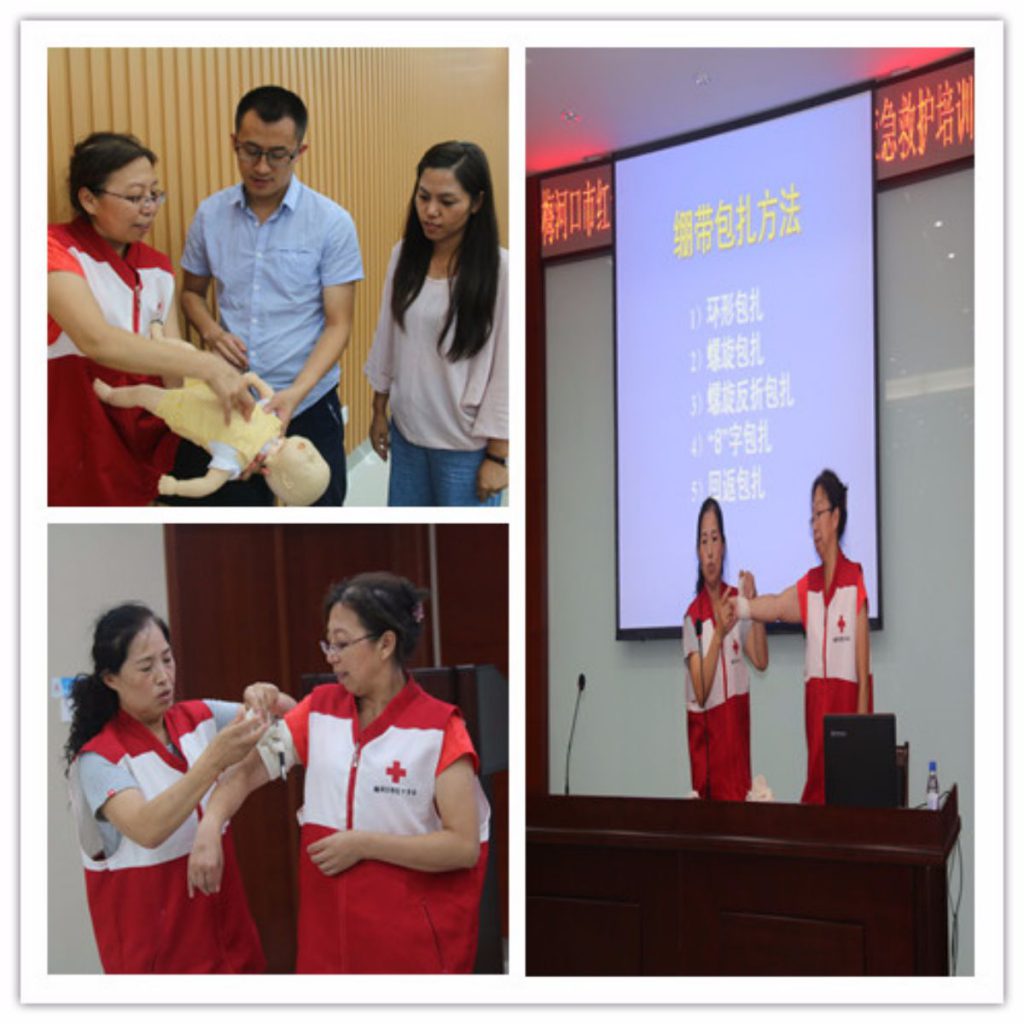 培训围绕心肺复苏、创伤救护基本技术,采取理论授课、示范操作及实际操作等方式进行。在示范操作演示中,详细地教授了心肺复苏、止血包扎的步骤方法及注意事项。