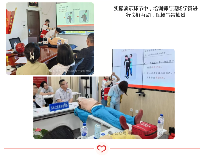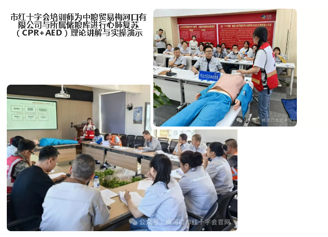 9月上旬,为提升企业职工生命安全保障水平,传播“人人学急救、急救为人人”的自救互救精神,结合实际提升应用操作水平,市红十字会应中粮贸易梅河口有限公司邀请,为其总部与所属储粮库开展了多期心肺复苏(CPR+AED)培训,同时结合其实际投放的自动体外除颤器(AED)型号,为企业员工进行理论与实操培训,总培训人数近80人,参训并通过理论与实践考核的学员将获得市红十字会颁发的证书。