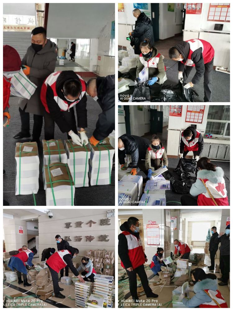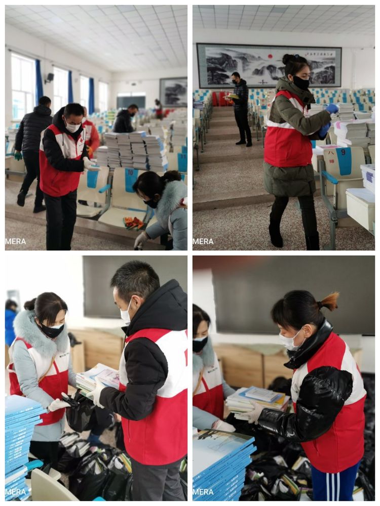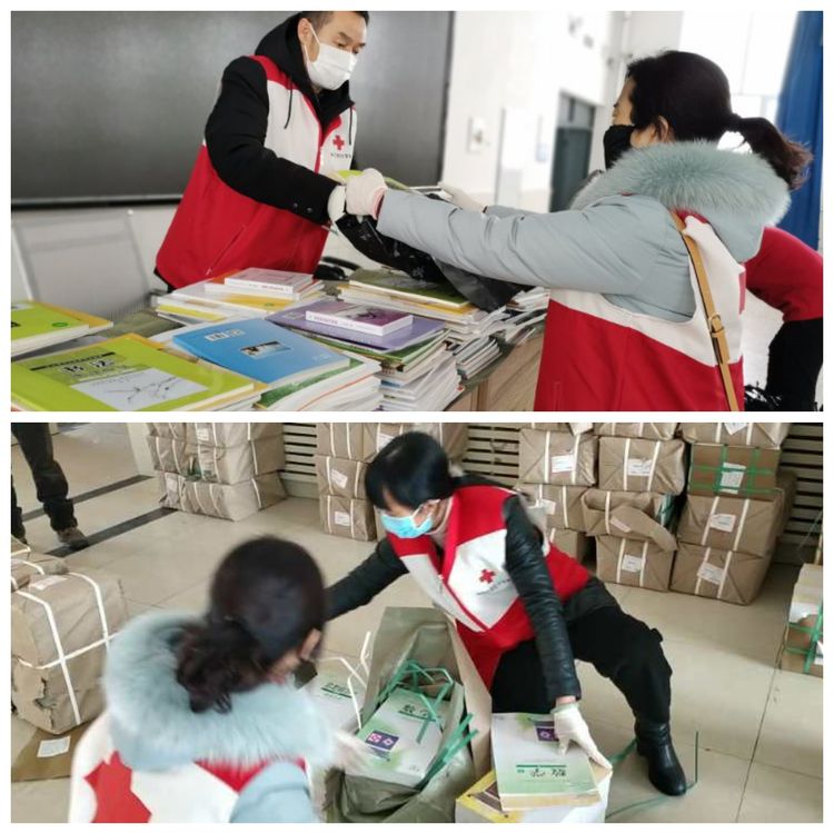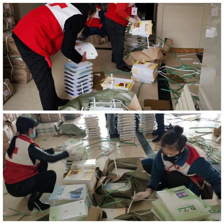 时值初春,室内阴冷至极,所有志愿者在封闭的没有休息场所的分装区域,不得不配戴双层口罩分检教材,连午饭都顾不上吃!有些年纪大点的志愿者因为长时间蹲起,累的腰都直不起来了;有的因为配戴双层口罩导致呼吸不顺畅,可大家一想到为了莘莘学子能够在家里读书学习,红会人必须坚持到最后,不畏辛苦。