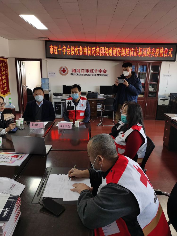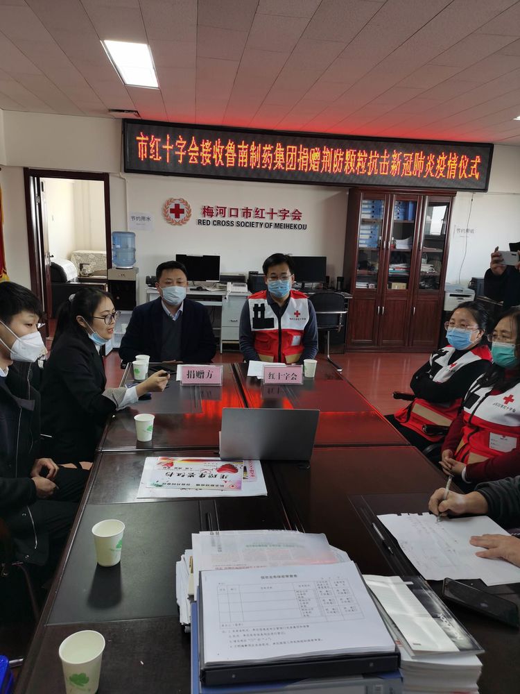 2021年1月23号上午,梅河口市红十字会举行山东鲁南制药集团捐赠药品荆防颗粒交接仪式。梅河口市红十字会副会长曾祥峰与捐赠方山东省临沂市红十字会代表鲁南制药集团负责人刘伟参加此次捐赠交接仪式。